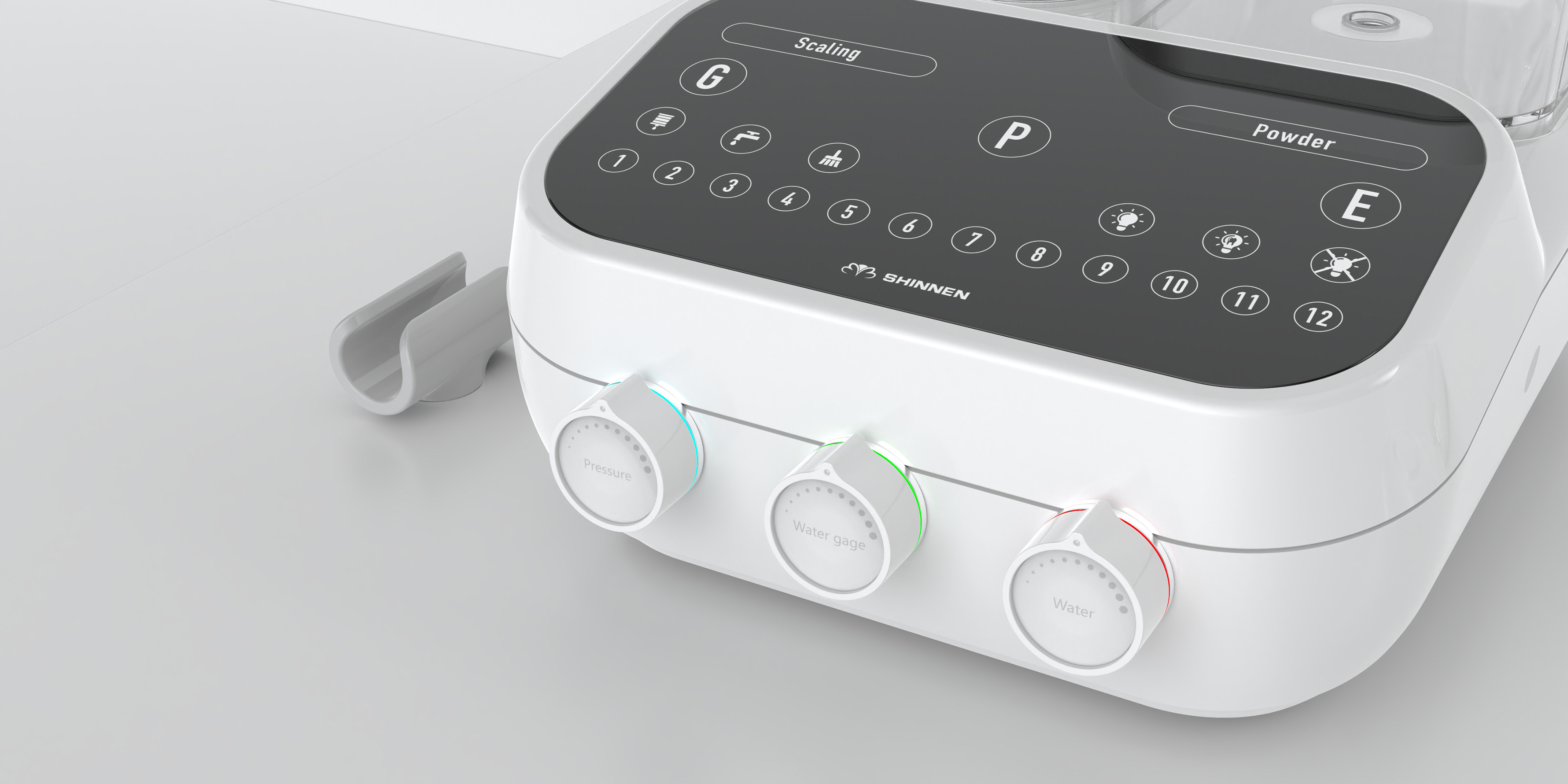 飽滿溫和的造型搭配白灰色調,彩色旋鈕燈光